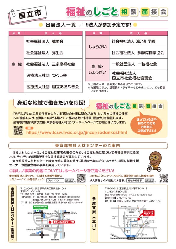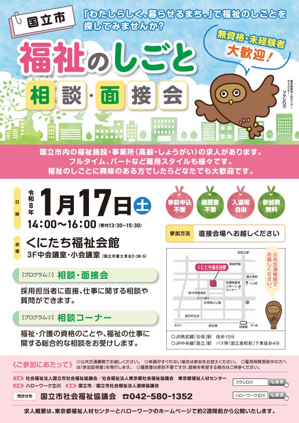 【東京・国立市】1/17(土)開催! 国立市「福祉のしごと相談・面接会」のご案内