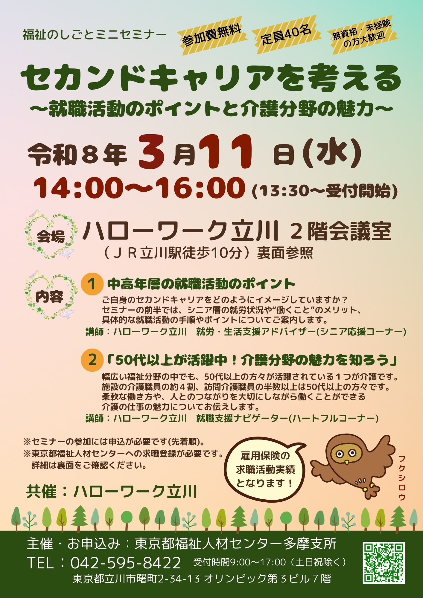 【東京・立川市】3/11(水)開催! <福祉のしごとミニセミナー「セカンドキャリアを考える」のお知らせ>