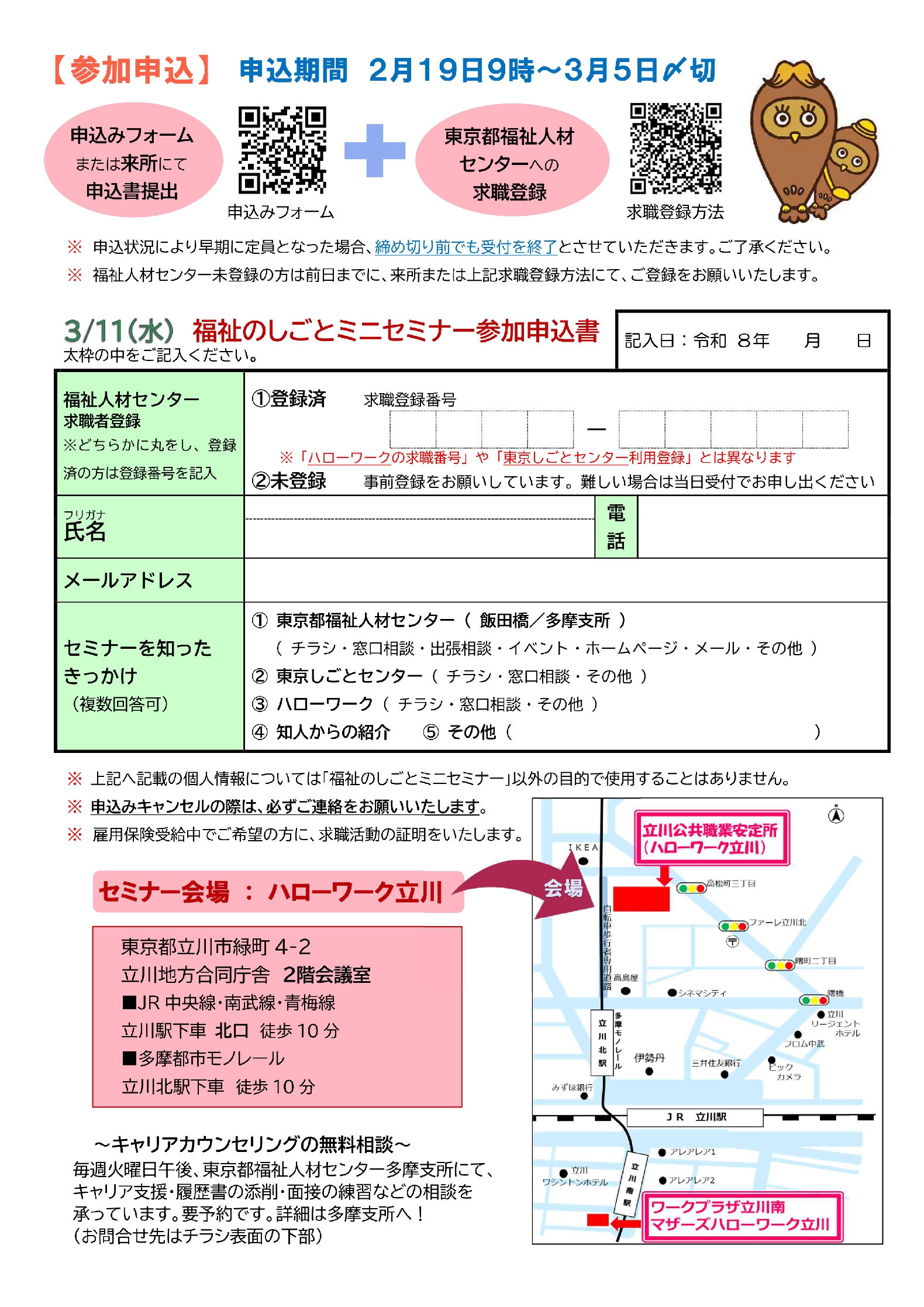 - セミナーへの申込みと併せて、東京都福祉人材センター 多摩支所への登録もお願いします。